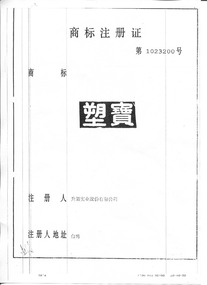 下列各式商標(biāo)為本公司于大陸取得之商標(biāo)注冊(cè),僅授權(quán)太倉(cāng)市塑寶環(huán)保機(jī)械及增城市升展機(jī)械公司使用,其余非經(jīng)我司書面許可而濫用者,本公司將采取法律行動(dòng),追索侵權(quán)之損害賠償。